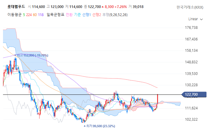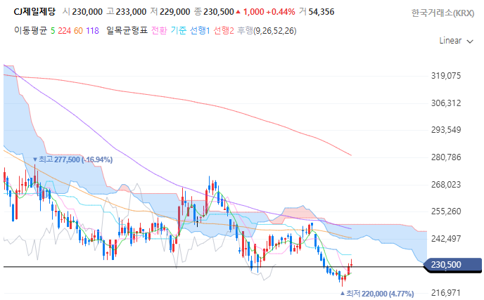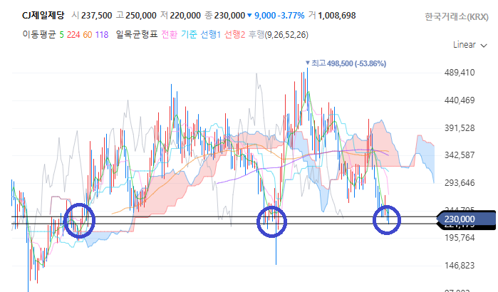 저는 분할매수를 해서 바닥을 잡고 상승세가 시작된다면 분할 익절을 통해서 수익을 보면서 저항과 지지를 오가는 파동에 대응할 계획입니다. 대략 10~20% 정도만 챙기고 나가도 괜찮다는 마인드로 접근 중입니다. 아마도, 롯데웰푸드가 122,700원을 강력하게 돌파한다면 식품주가 전반적으로 반응하게 되는 신호로서 작용될 가능성이 있습니다. 국내 식품 기업 1위는 CJ제일제당이며 저평가 상태라고 생각합니다. 게다가 CJ제일제당은 역사적으로 보더라도 많이 낮은 가격에서 자리를 잡고 있는 것 같습니다.