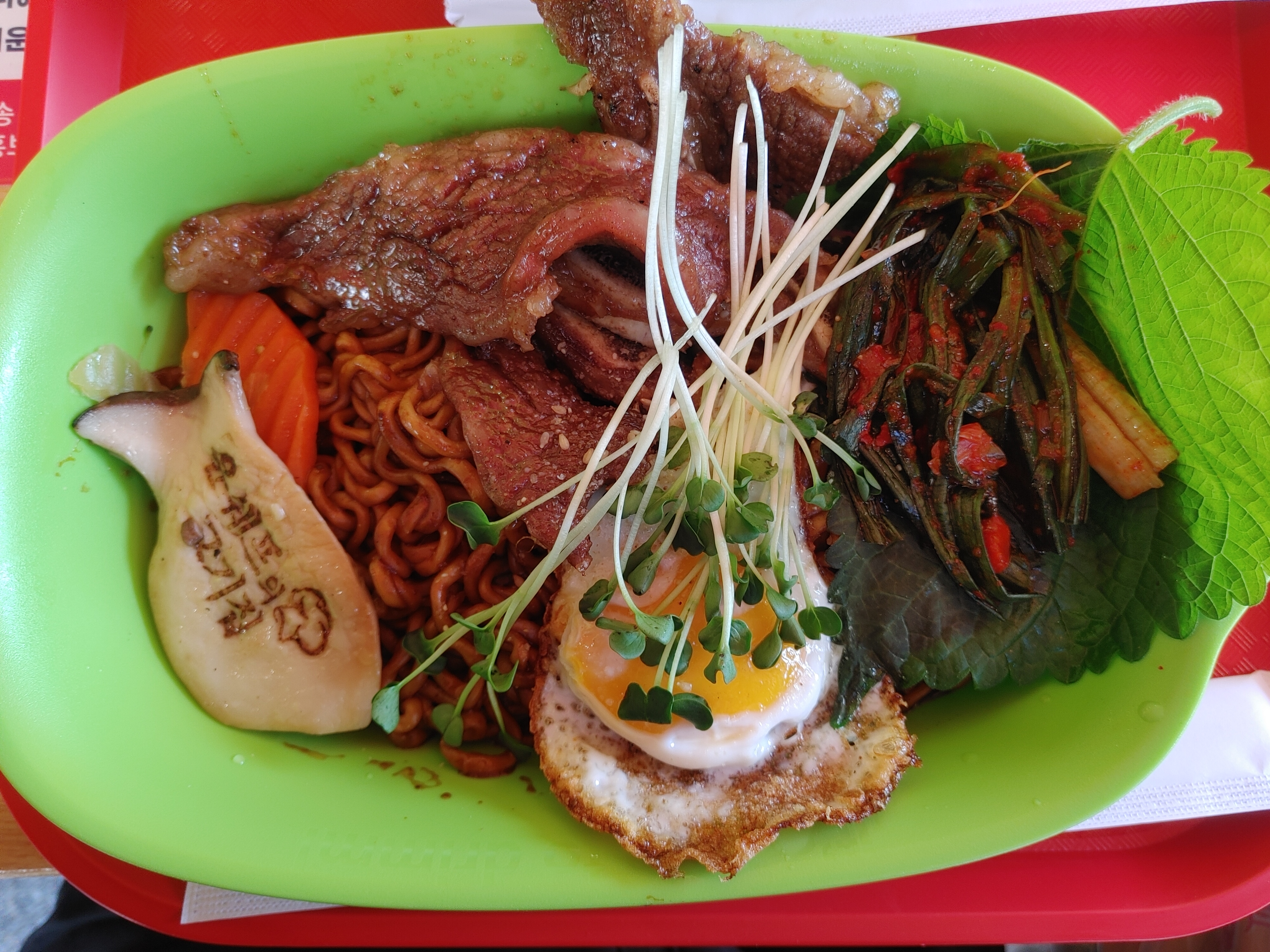 우선, 꿀배LA갈비 짜장라면은 짜파게티 위에 고기와 파김치, 깻잎 한 장, 계란, 버섯, 당근을 올린 거였습니다. 고기가 나름 많이 올라가 있어서 9000원이 크게 비싸다는 느낌은 없었습니다만 한우 대창 야끼 라면은 대창이 비싸서 그런 건지 너무 조금만 올라가 있어서 가성비가 별로라는 인상을 받았습니다. 치즈&주먹밥 라볶이는 김밥나라에서 간단하게 먹을 수 있는 떡볶이 양념 기반이었는데요. 행사장에서 먹을 때도 같은 생각이었지만 요리가 수준이 높다라는 느낌보다는 라면 자체가 맛있다는 인상을 받았습니다. 확실히, 갓 튀긴 라면은 면의 탄력부터 만든 지 오래된 것과는 결이 달랐습니다.