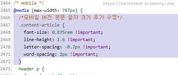 (3) 모바일에서 본문 글 간격 css를 추가합니다.