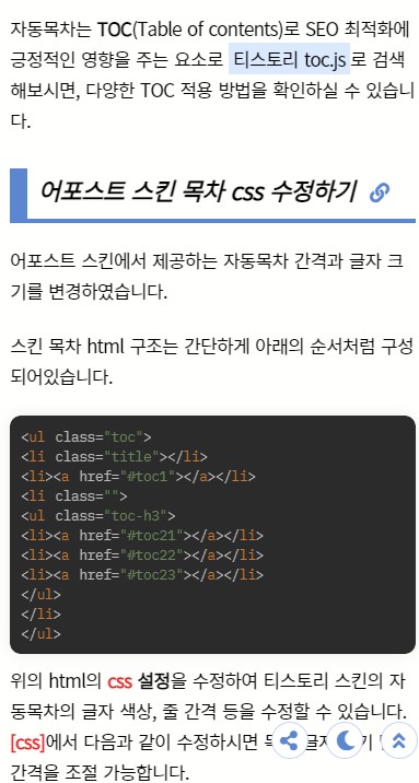 | 어포스트 스킨 자동 목차 크기 간격 수정하기 (티스토리 스킨 목차 변경) (0) | 2021.07.05 |