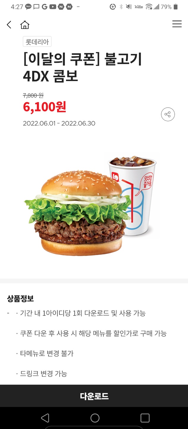 ▲ 롯데리아 불고기 4DX 할인 쿠폰을 다운 받을 수 있는 '롯데이츠'