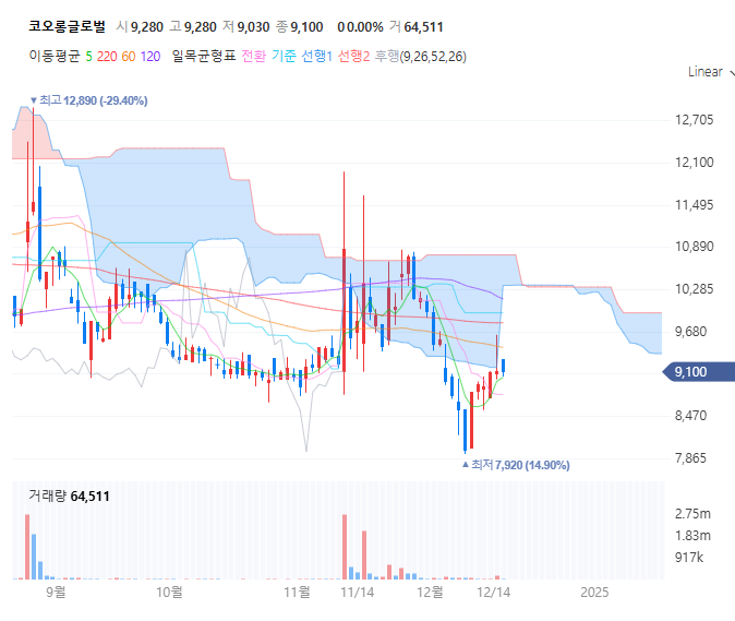 저는 12월 12일에 평단가 8779원으로 재진입했으며 글을 쓰고 있는 현재 기준으로 9100원으로 수익을 보고 있지만 우선 목표 가격은 1만원으로 보고 있습니다. 하지만, 대형 이슈가 터진다면 1만 4천원까지도 열려 있다고 추측하고 있습니다.